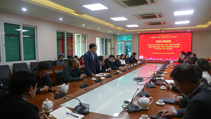 Đại diện Viện KHCN Xây dựng, Lãnh đạo phòng Tổ chức - Hành chính công bố quyết định số 3167/QĐ-VKH ngày 25 tháng 12 năm 2025 của Viện trưởng Viện KHCN Xây dựng về việc điều động và bổ nhiệm có thời hạn ông Hoàng Mạnh, Tiến sĩ kỹ thuật, Phó trưởng phòng Kế hoạch kỹ thuật giữ chức vụ Giám đốc Trung tâm Tư vấn thiết bị và xây dựng, Viện KHCN Xây dựng.
