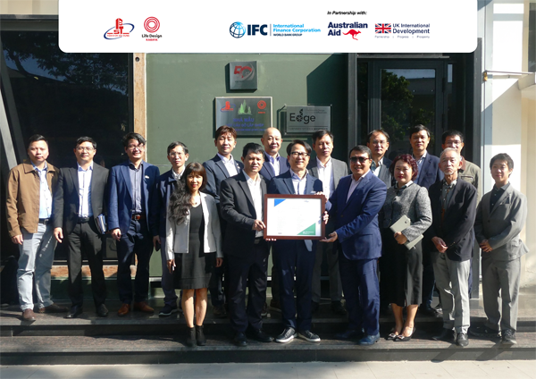 Ông Lâm Bảo Quang, Giám đốc văn phòng đại diện Tổ chức Tài chính Quốc tế (IFC) tại Hà Nội trao giấy chứng nhận Edge Zero Carbon cho công trình “Nhà mẫu - kết cấu gỗ lắp ghép”